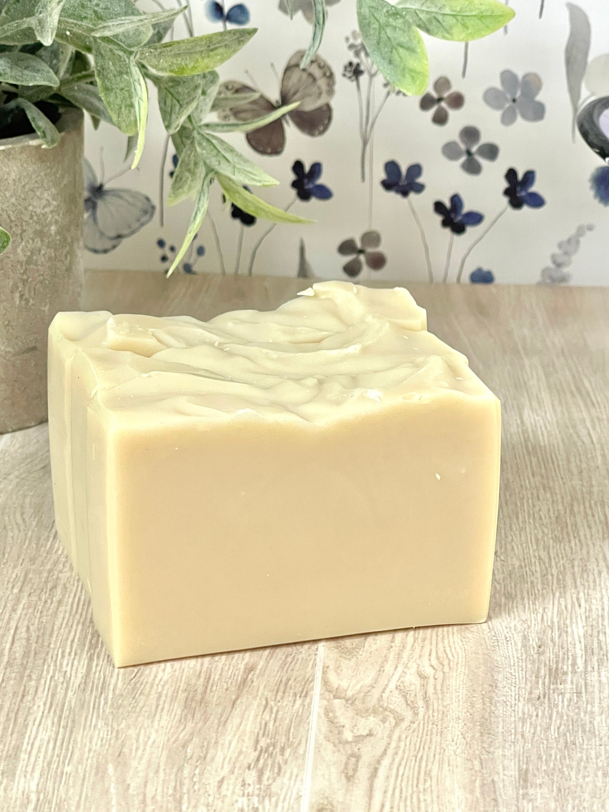 Made with: Goat Milk, Saponified oils of: Lard, Shea Butter, Coconut Oil, Olive Oil, and Castor oil. Sodium Lactate, Colloidal Oatmeal Powder and Tussah Silk. This is a wonderful soap for sensitive dry skin.