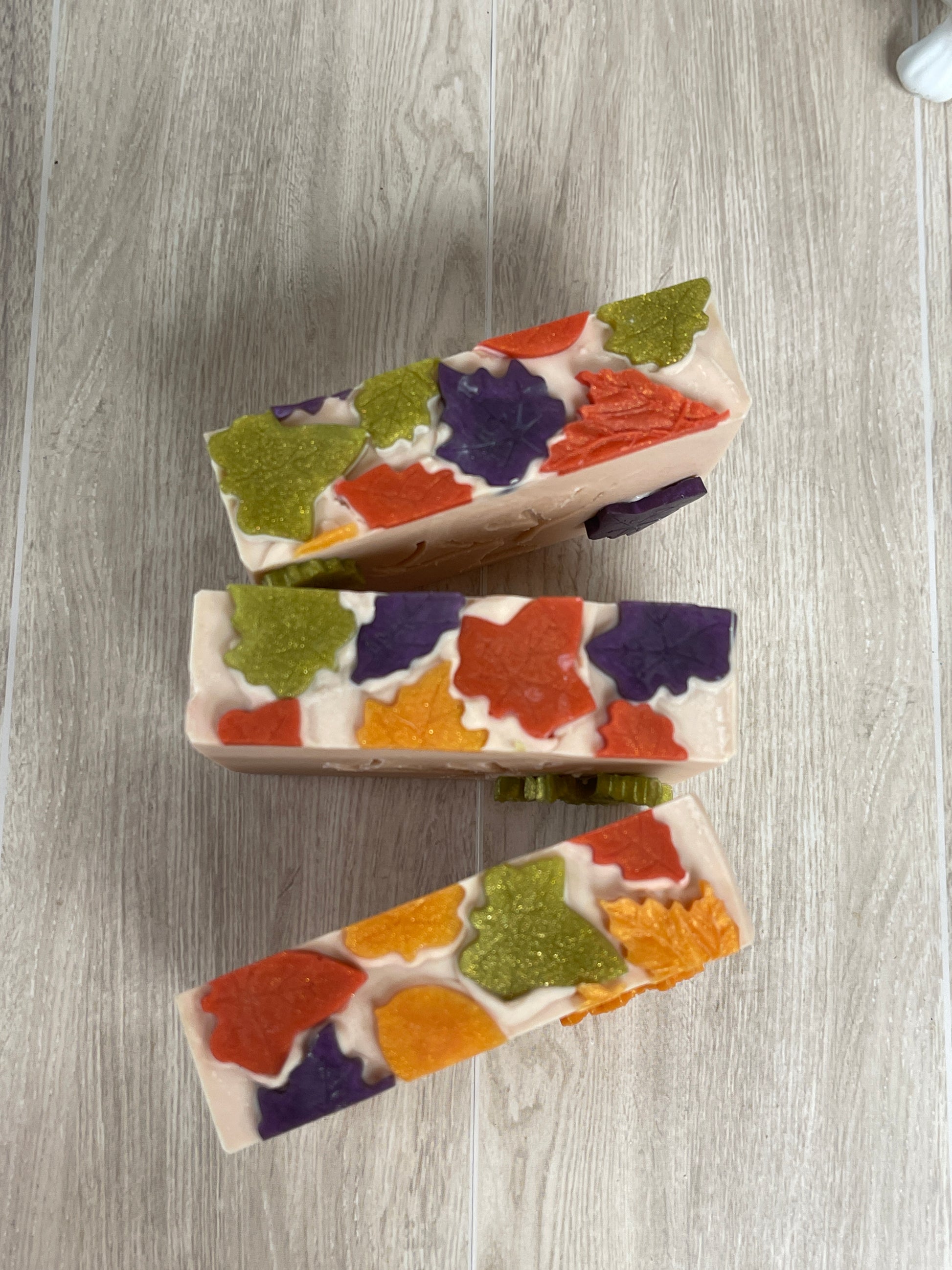 Goat Milk, Saponified oils of: Lard, Organic Shea Butter, Coconut Oil, Castor oil, Phthalate-Free fragrance oil, glycerin soap embeds, Sodium Lactate, Mica Colorants and Tussah Silk.