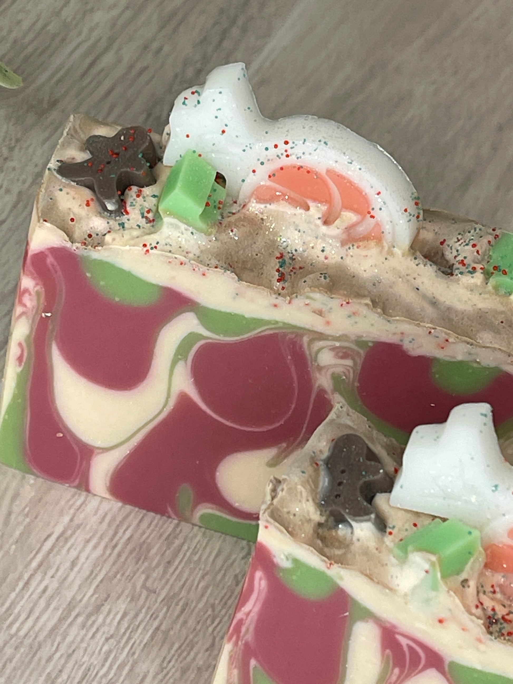 Made with: Goat Milk, Saponified oils of: Lard, Shea Butter, Coconut Oil, and Castor oil. Glycerin soap embeds, Sodium lactate, titanium dioxide, Mica colorants and Phthalate Free fragrance oils, Activated Charcoal, eco-glitter and Tussah Silk. These do contain a paper straw, remove before use.